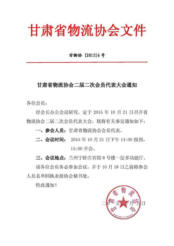甘肅省物流協會二屆二次會員代表大會通知