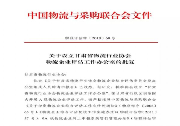 5月20日,中國物流與采購聯合會正式批準設立“甘肅省物流行業協會物流企業評估工作辦公室”,在甘肅省行政區劃范圍內開展A級物流企業評估工作。年內,評估辦已組織10家企業通過3A和4A級物流企業評估。