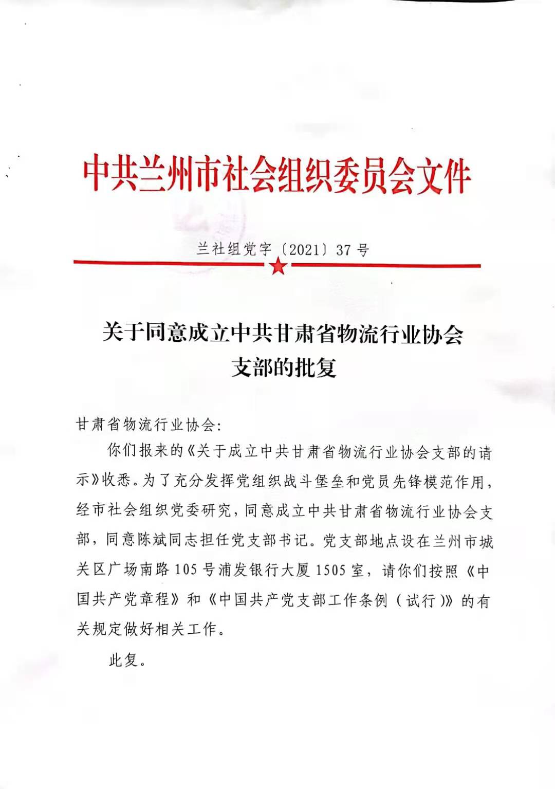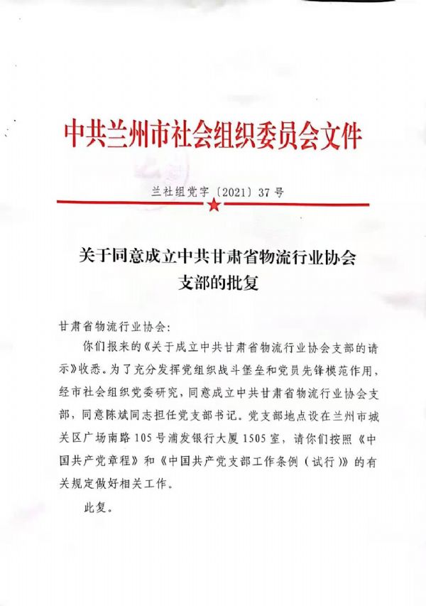關于同意成立中共甘肅省物流行業協會支部的批復